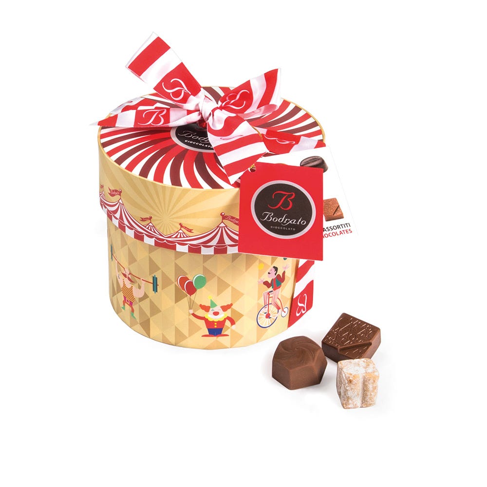 Filled Pralines Cover: Dark chocolate (cocoa:60% min) (cocoa mass, sugar, cocoa butter, emulsifier: SOY and sunflower lecithin, natural vanilla flavor). Milk chocolate (cocoa: 35% min) (sugar, cocoa butter, whole MILK powder, cocoa mass, emulsifier: SOY and sunflower lecithin, natural vanilla flavor)Filling Hazelnut cream fr. 1 praline: HAZELNUTS 13%, sugar, vegetable oils and fats (sunflower, coconut, cocoa butter), skimmed MILK powder, WHEY powder (MILK), cocoa butter, emulsifier: SOY and sunflower lecithin, natural vanilla flavor.Filling trottola praline: vegetable oils and fats (sunflower, coconut, safflower, rice, cocoa butter), sugar, low fat cocoa powder 6,4%, skimmed MILK powder, WHEY powder (MILK), cocoa mass 1,3%, emulsifier: SOY and sunflower lecithin, natural vanilla flavor, vanillin.Filling Bonet praline: sugar, vegetable oils and fats (sunflower, coconut, safflower, rice, cocoa butter), low fat cocoa powder 5,6 %, skimmed MILK powder, chopped amaretto 2% (sugar, apricots kernel, EGG whites), WHEY powder (MILK), cocoa mass 1,5%, whole MILK powder, cocoa butter, amaretto flavor 0,1%, emulsifier: SOY and sunflower lecithin, natural vanilla flavor, vanillin.Filling coffee praline: sugar, vegetable oils and fats (sunflower, coconut, cocoa butter), skimmed MILK powder, WHEY powder (MILK), Huehuetenango coffee powder 2%, emulsifier: sunflower lecithin, natural vanilla flavor.Giandujotto classic Sugar, HAZELNUTS, cocoa butter, cocoa mass, whole MILK powder, emulsifier: SOY and sunflower lecithin, natural vanilla flavor.