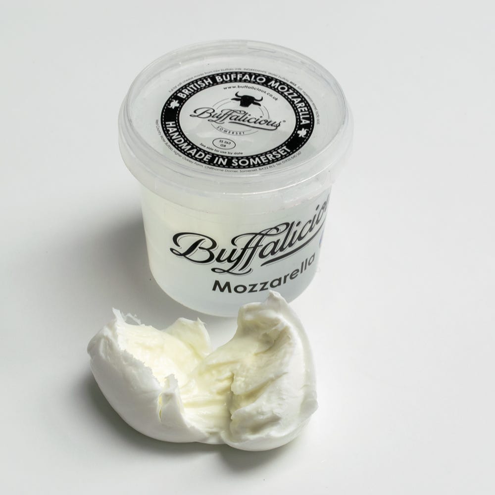 At long last, a perfect British buffalo milk Mozzarella. Made by Jonathan Corpe on the family farm near Yeovil, from the milk of their own herd of water buffalo. Jonathan’s father swapped from cows to water buffalo back in the 90s, but soon concentrated on meat, rather than dairy. Like many sons of farmers, as a young man Jonathan left to forge a new career for himself, but soon felt the call to return to the farm and the animals. The meat business was well established but Jonathan believed the time had come to bring some milkers into the herd and experiment with Mozzarella. Mozzarella is notoriously difficult to make well. As Jonathan says, “There’s nowhere to hide when it comes to making good Mozzarella”. It is a deceptively simple cheese and has to be just right to capture the buffalo milk to perfection. Jonathan stretches and spins the curd by hand himself. Timing is crucial to get just the right elasticity, as, when it comes to Mozzarella, the texture is just as important as the flavour. Luckily his study, research and hard work have all paid off. This is a British Mozzarella of which he can be truly proud.