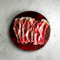 Prosciutto Cotto (Cooked Ham) 100g Presliced and laid by hand in MAP tray. Produced with real artisanal technique on the Parma hills, our cooked ham is a soft, sweet and velvety delicatessen product. It is characterized by a particularly delicate perfume and the soft pink color of the slice. Our cooked hams are obtained from pork legs selected with care and experience to obtain a product of the highest quality with a unique flavor that respects the natural taste of the meat. The thighs are then processed with spices and placed in a mold to be cooked. Subsequently, the ham is trimmed, packaged and pasteurized with the final result of charcuterie product with a very high percentage of meat compared to the average of the reference sector, which makes it a highly prized cooked ham with strong technical and nutritional features.