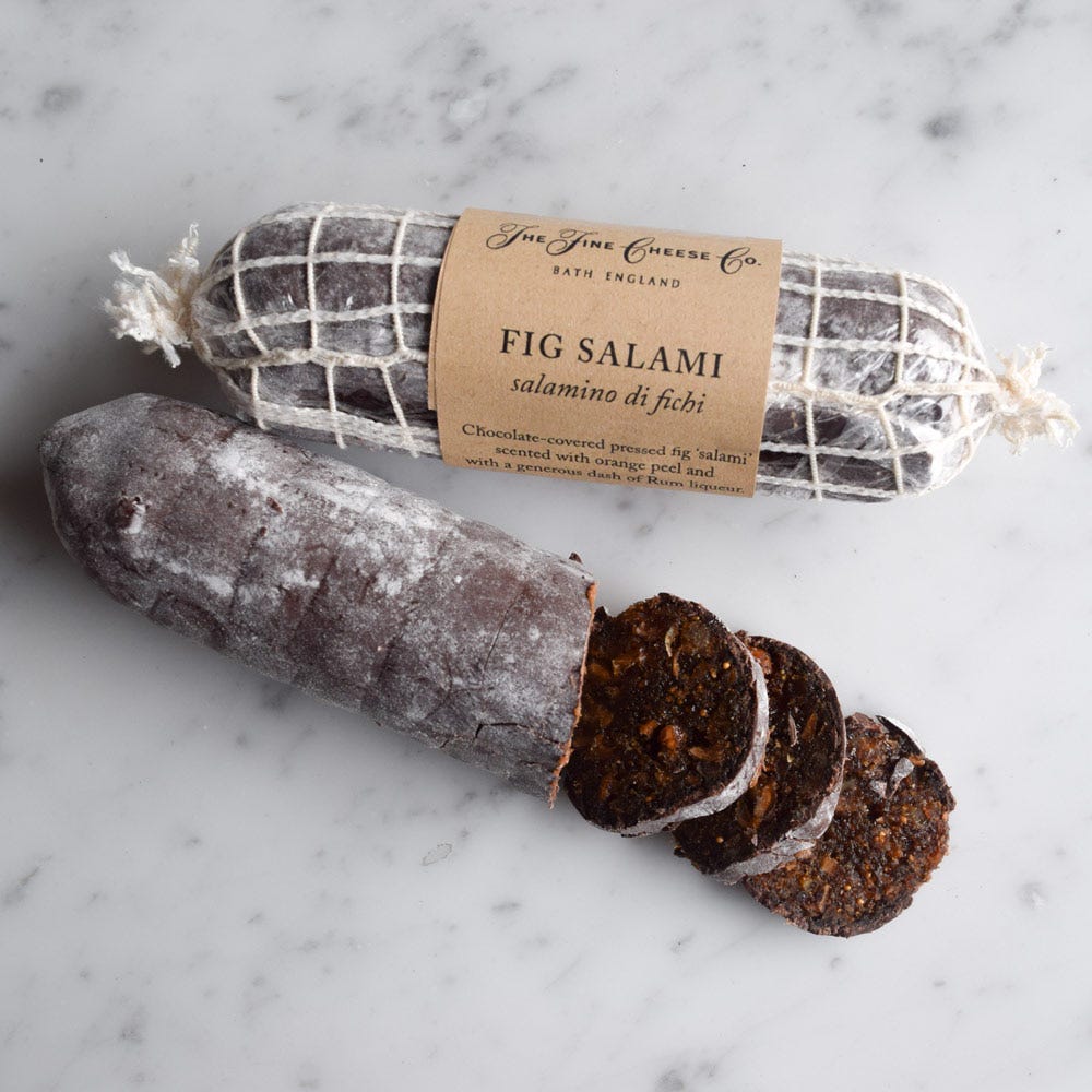 Chocolate-covered pressed fig 'salami' scented with orange peel and with a generous dash of rum.