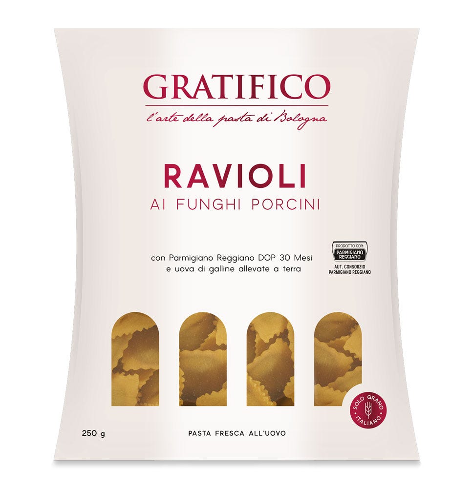 Fresh-filled pasta, from Bologna, Italy. Filled with Porcini mushroom, soft fresh Ricotta, and 30-month Parmigiano Reggiano DOP. Cooks in 4 minutes. Keep chilled.
