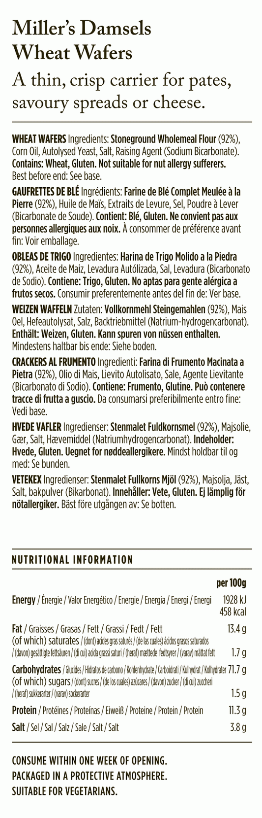 Three perfect neutral, hexagonal wafers in upright boxes. Our top sellers: Wheat and Charcoal, plus Buttermilk: a tangy, blonde wafer with a rich tang. Made with stone-ground flour, grown and milled in England, or with English butter and buttermilk.