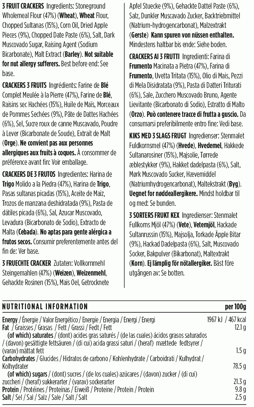 A trio of ingredients baked into a delicious square cracker, moving the humble cracker into a new direction. Miller's Harvest Three-Fruit crackers, created with honest values, and an emphasis on the simplicity and goodness of natural ingredients.