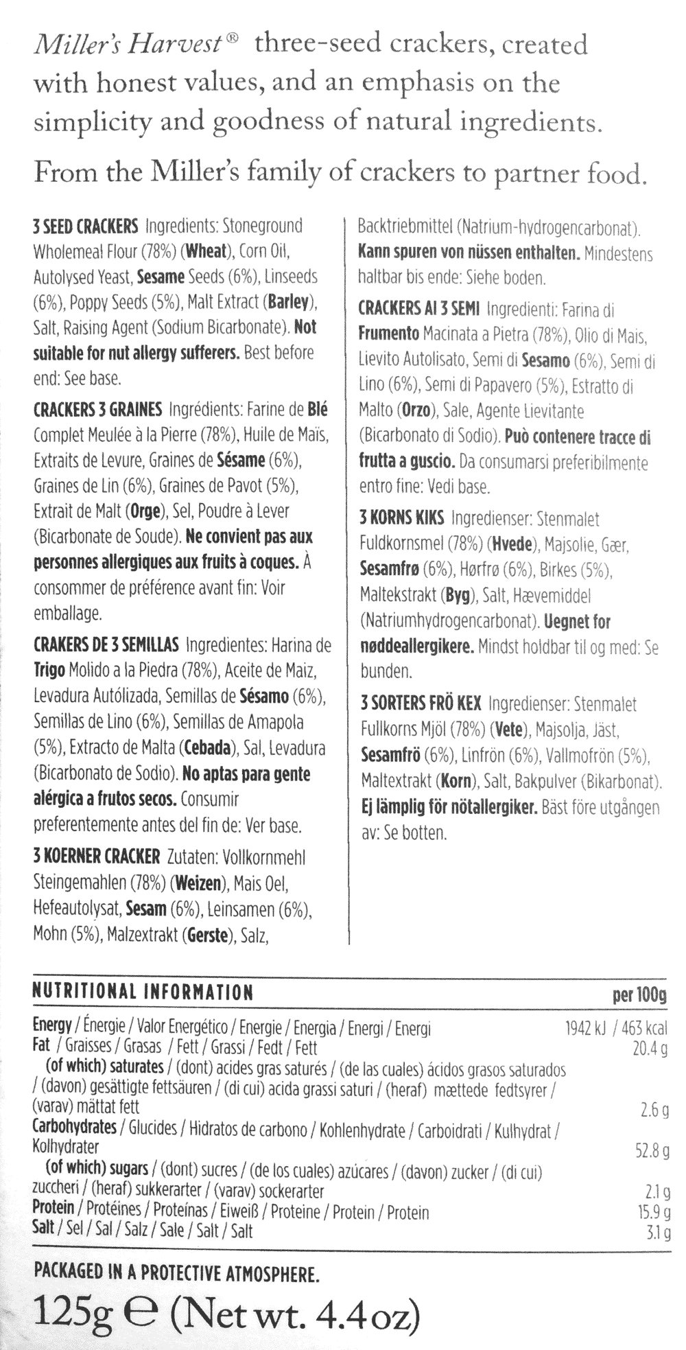 A trio of ingredients baked into a delicious square cracker, moving the humble cracker into a new direction. Miller's Harvest three-seed crackers, created with honest values, and an emphasis on the simplicity and goodness of natural ingredients.