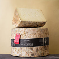 For fourteen generations, the Quicke family have been farming in the village of Newton St. Cyres, just North of Exeter. Dedicated cheddar makers, their dairy herd of mixed-breed cows, and 2,700 acres of grasslands and oak woodlands are currently managed by Mary Quicke and her daughter Jane. A play on a classic theme, this cheese is hand-made in the style of traditional Cheddar, but with locally sourced goats’ milk. Clothbound and matured for around six months in the Cheddar store, it develops a well-rounded character quite unlike other goats’ milk cheeses.