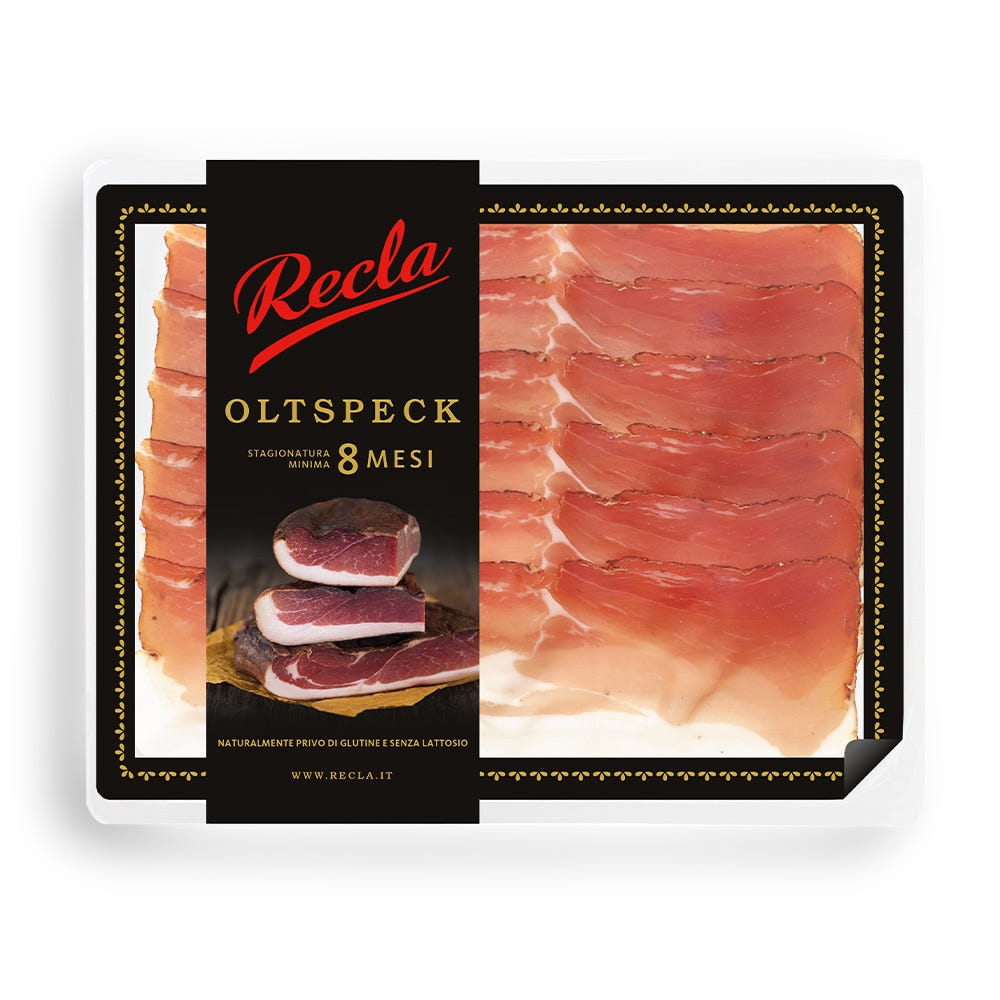 Mountainous South Tyrol lies along Italy’s border with Austria, resulting in a Tyrolean cuisine is a melting pot of both countries. Third generation salumi producers Robert and Paul Recla make their Speck Alto-Adige below the Alps in the beautiful and uniquely dry and sunny Vinschgau Valley, also known as Val Venosta. Only a few hams are considered fine enough by the brothers to become their traditional Oltspeck. Particularly well-marbled, it is rubbed with the family’s secret mix of spices and herbs, beechwood smoked, and air-dried for at least eight months – three months longer than a typical Speck would age. The smoke is prominent, but it is the particularly complex and sweet flavour of Oltspeck that makes it stand out above the rest.