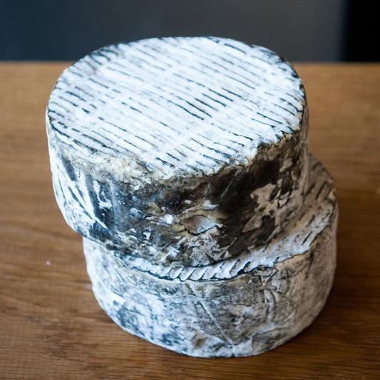 Delicate and creamy. Tradition and milks combine to make this little charcoal cheese. Three separate milks are used, that of cows, goats and sheep, and ash is then sprinkled on the young cheeses to form a stylish and characteristic rind.