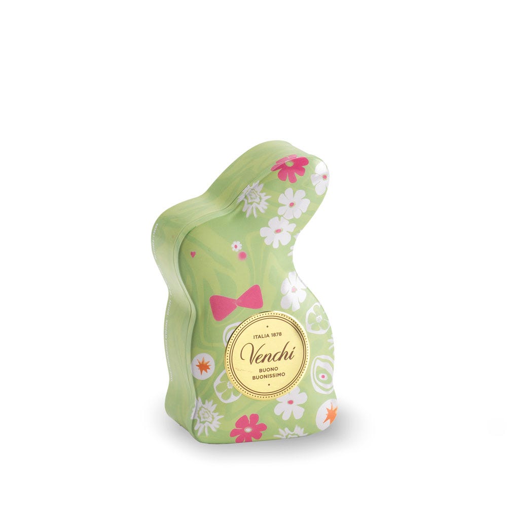 Decorative spring patterned bunny-shaped metal tins containing double extra dark chocolate with salted hazelnuts and caramel mini eggs.Assorted colours.