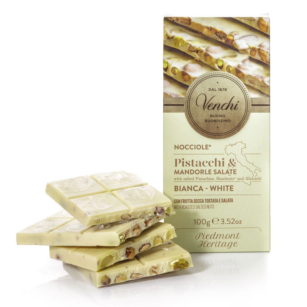 White chocolate bar with salted pistachios, hazelnuts and almonds.